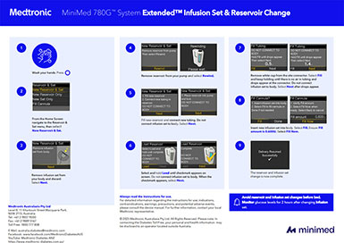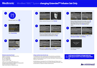 Infusion sets Changing Extended™ Reservoir only with MiniMed™ 780G System Changing Extended™ Infusion Set & Reservoir with MiniMed 780G™ System Changing Extended™ Infusion Set Only with MiniMed 780G™ System Taping tips for Extended Infusion Set & Guardian CGM Systems Extended™ Infusion Set - How to turn off Set Change reminder IFU - Extended™ Infusion Set IFU - Extended™ Reservoir Extended™ Infusion Set - Brochure Medtronic infusion set comparison chart 1pp Infusion Guide Infusion Set Digital Guide MiniMed 780G Sure-T Infusion Set MiniMed 780G Silhoutte Infusion Set MiniMed 780G Quick Set Infusion Set MiniMed 780G Mio infusion set MiniMed® 670G Sure T infusion set instructions MiniMed® 670G Silhouette Infusion Set Instructions MiniMed® 670G Quick Set Infusion Set Instructions MiniMed® 670G Mio® Infusion Set Instructions